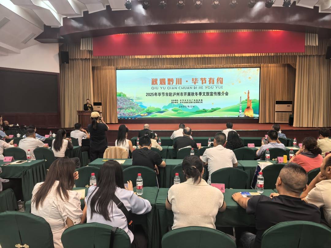 9月24日,贵州省毕节市赴四川省泸州市开展秋冬季文旅宣传,携带“地球彩带、世界花园”百里杜鹃、“世界地质公园”织金洞、“高原明珠”威宁草海等世界级、国家级旅游资源,向泸州的旅行社及市民发出秋冬的邀请。