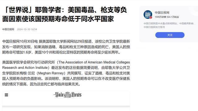 除了枪支,药物滥用也是美国的大麻烦,有些药厂为了赚钱,故意夸大一些药的疗效,不说容易成瘾的事儿,导致好多人稀里糊涂就用上了瘾。 耶鲁大学公共卫生学院做了个研究,结果特直白:要是能把酒精、毒品、枪支这三样搞出来的死亡给杜绝了,美国人平均能多活1.6岁!