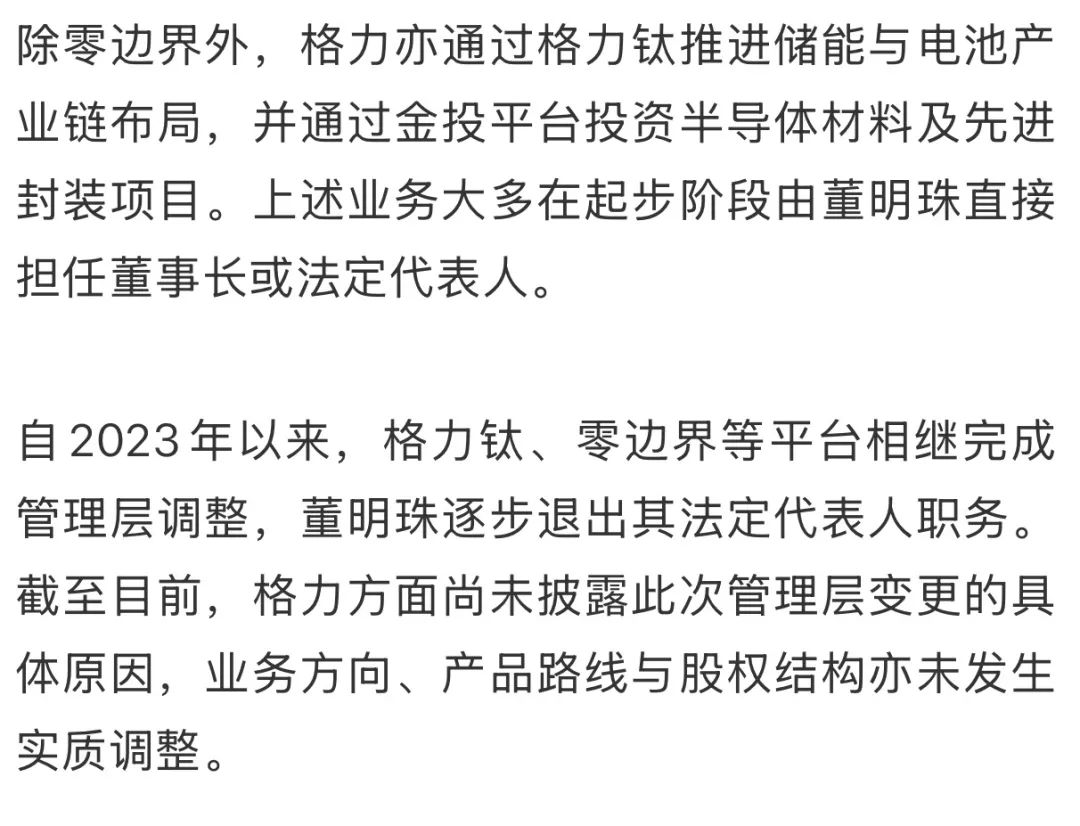 近日,根据公开信息显示,珠海零边界集成电路有限公司发生工商变更,董明珠卸任法定代表人、董事长,由李绍斌接任法定代表人,并由经理、董事变更为执行公司事务的董事、经理、谭建明退出董事行列。