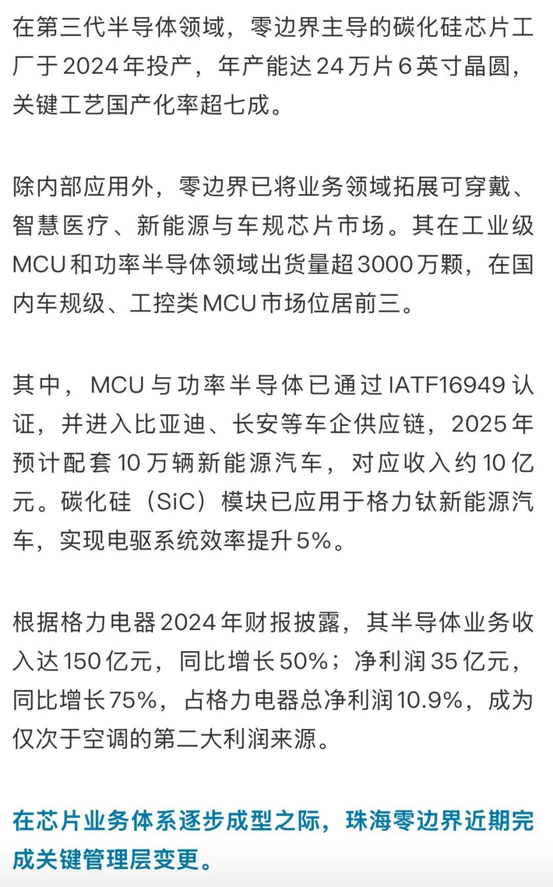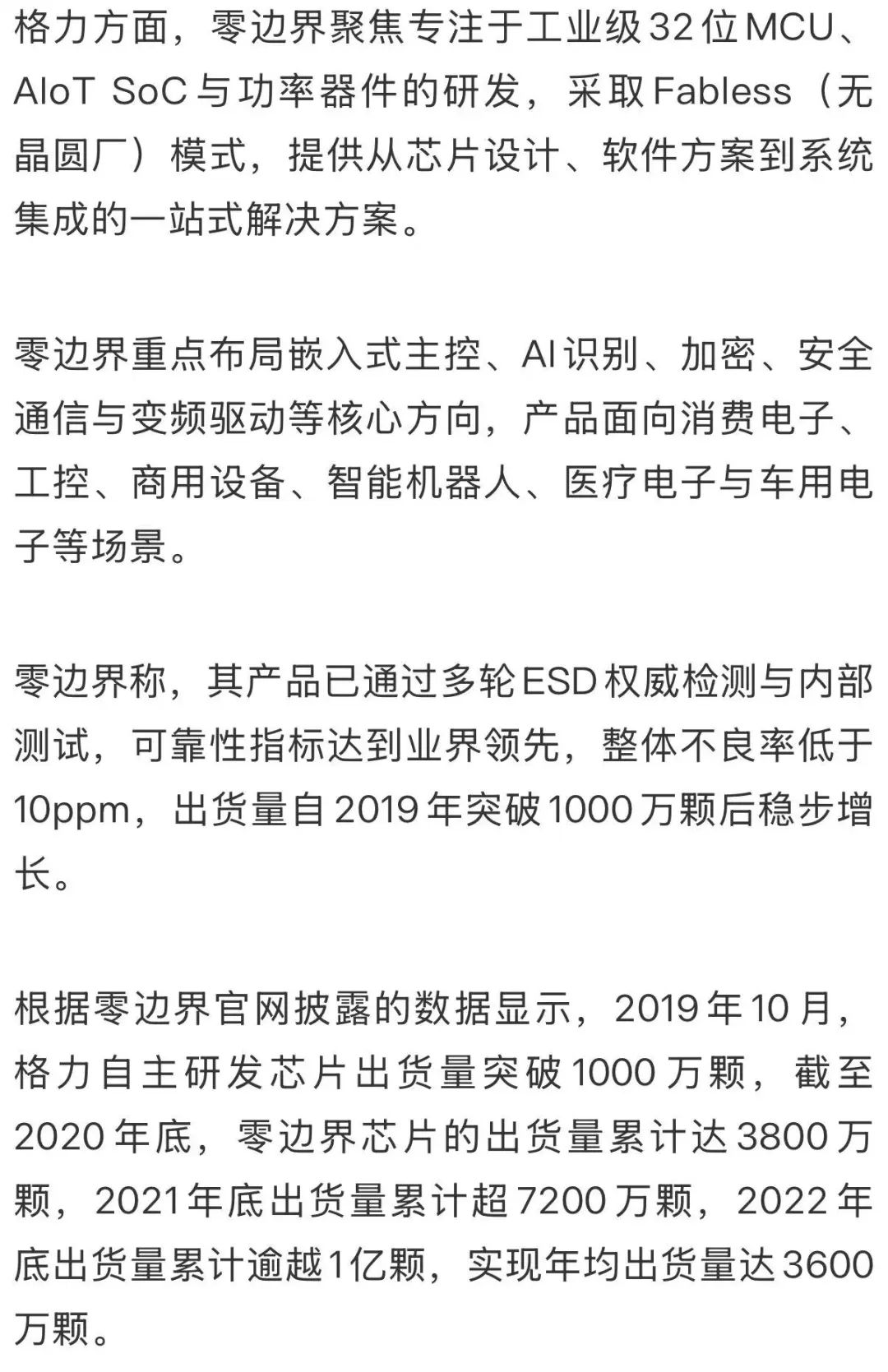 记者注意到,珠海零边界集成电路有限公司(下称:零边界)成立于2018年8月,为格力电器全资控股子公司,是其切入半导体产业的重要平台。